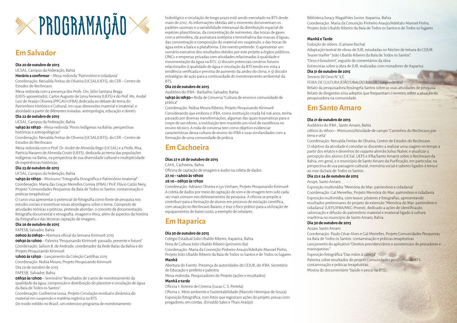 Em 2015, em sua quinta edição, a Semana Kirimurê teve um desenho diferente. Com o tema Retorno às Comunidades, a SK 2015 buscou aproximar os grupos de pesquisa e os projetos da Rede Baía da Bahia, entre si e entre as comunidades da Baía de Todos os Santos, e, por esta razão, contou com uma multiplicidade de eventos, realizados em Salvador, Ilha de Itaparica, Santo Amaro (Acupe) e Cachoeira, entre os dias 20 e 31 de outubro. A abertura oficial aconteceu na FAPESB, em Salvador, no dia 26.10, com a presença de autoridades, e posterior palestra do Prof. Jailson B. de Andrade, coordenador do Projeto “Pesquisando Kirimurê: passado, presente e futuro”, articulador da Rede e da Onda 02 do Projeto BTS. Ainda naquela manhã, houve o lançamento da Coleção Cartilhas 2015, sob coordenação da Profa. Núbia Moura Ribeiro. Esta foi a primeira SK sem a já tradicional exposição de posters dos alunos, mas com seu envolvimento nas atividades nas muitas localidades. Para ter uma visão detalhada da riqueza da programação, acesse o folder da SK 2015.